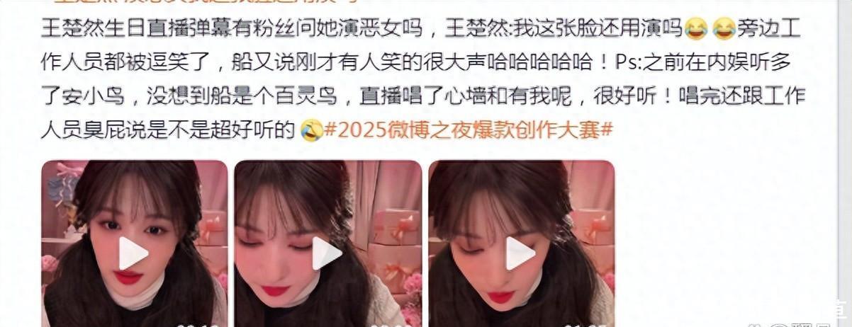在王楚然的生日直播中,粉丝通过弹幕提问:“演恶女吗?”王楚然自信反问“我这张脸还用演吗”,并调侃现场“有人笑得很大声”。